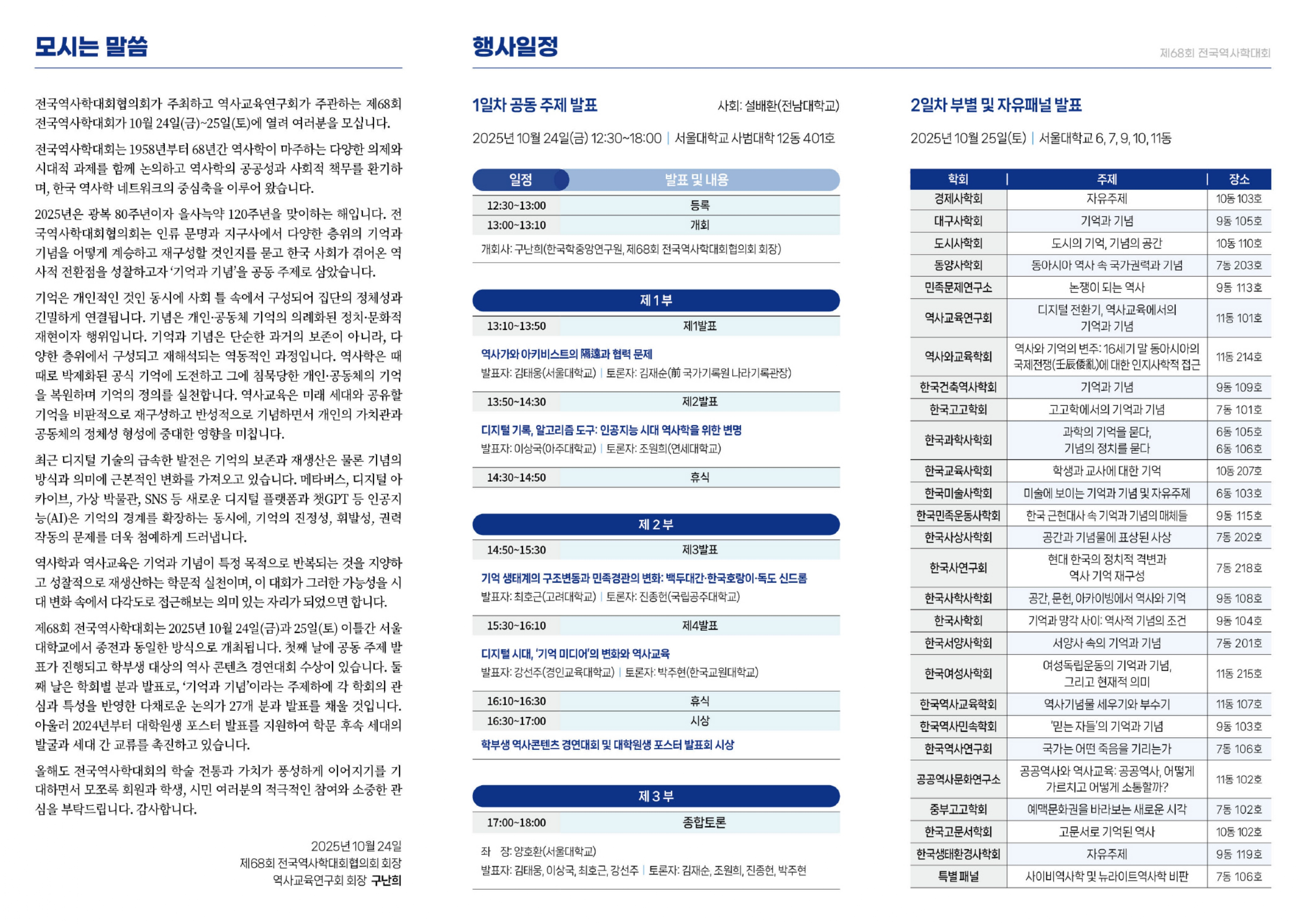 제68회 전국역사학대회는 2025년 10월 24일(금)과 25일(토) 이틀간 서울대학교에서 종전과 동일한 방식으로 개최됩니다. 첫째 날에 공동 주제 발표가 진행되고 학부생 대상의 역사 콘텐츠 경연대회 수상이 있습니다. 둘째 날은 학회별 분과 발표로, ‘기억과 기념’이라는 주제 하에 각 학회의 관심과 특성을 반영한 다채로운 논의가 27개 분과 발표를 채울 것입니다. 아울러 2024년부터 대학원생 포스터 발표를 지원하여 학문 후속 세대의 발굴과 세대간 교류를 촉진하고 있습니다.