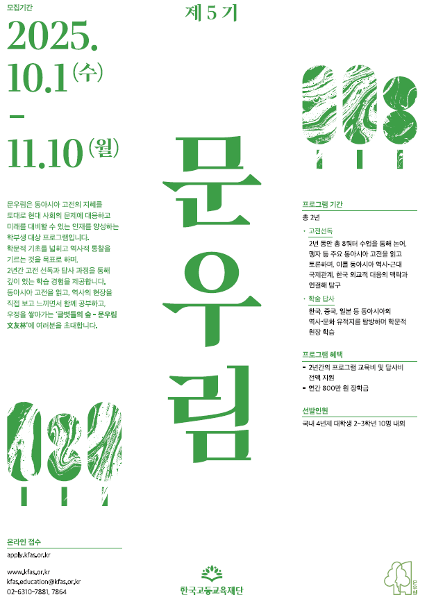 한국고등교육재단에서 '문우림' 제5기 장학생을 모집하고 있습니다.
