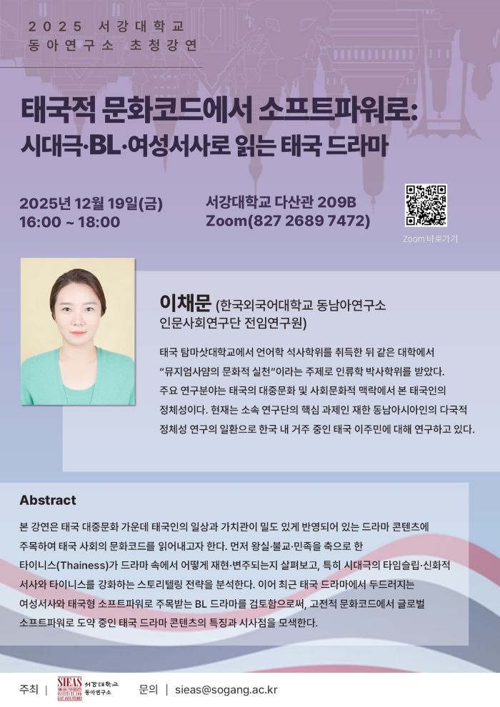 안녕하세요. 서강대학교 동아연구소에서 2025년 12월 19일(금) 오후 4시부터 한국외국어대학교 동남아연구소 인문사회연구단의 이채문 전임연구원님을 모시고 초청강연을 진행합니다.