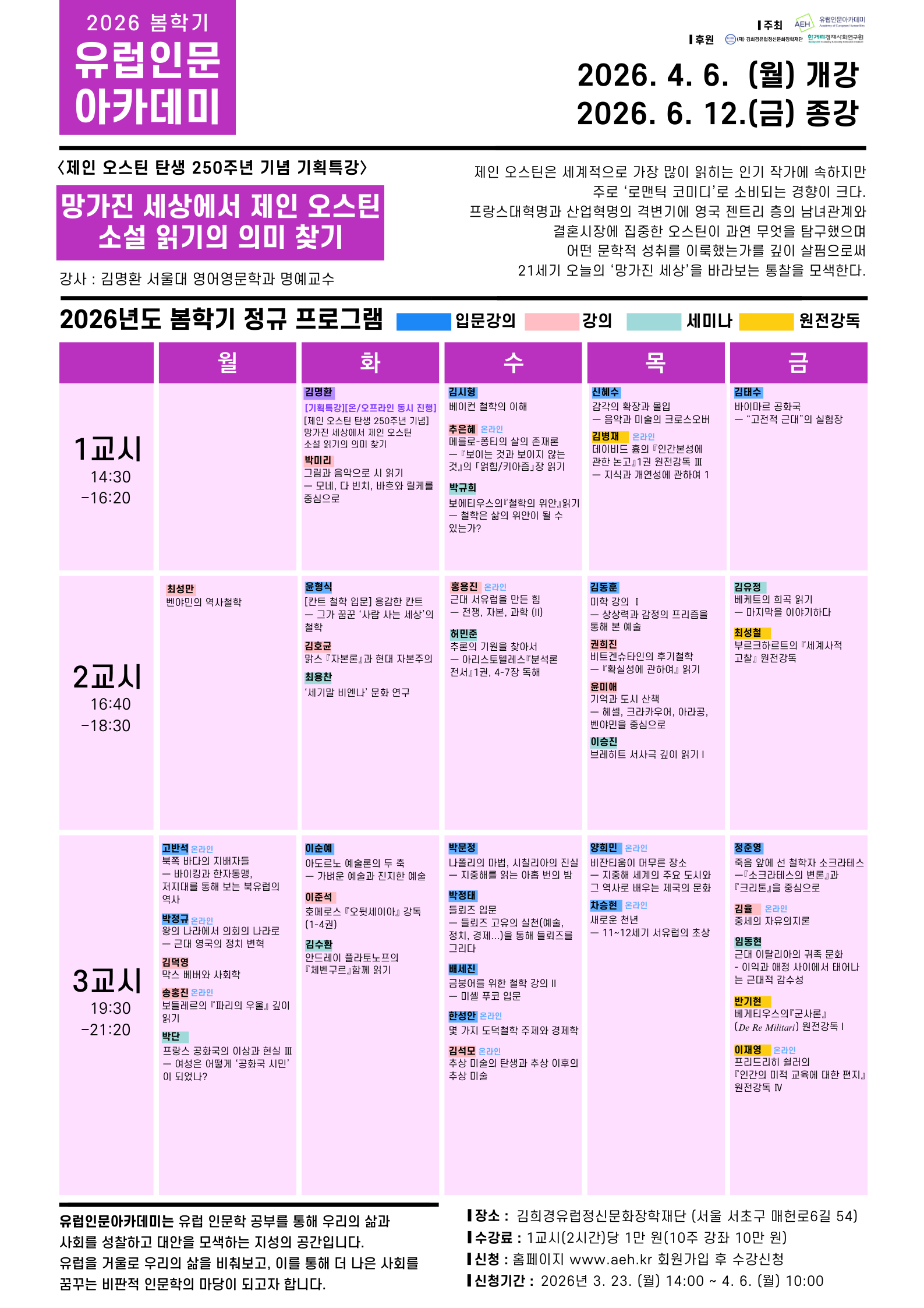 유럽인문아카데미는 유럽 인문학 공부를 통해 우리의 삶과 사회를 성찰하고 대안을 모색하는 지성의 공간입니다. 본격 인문 강좌들을 통해 인문학의 새 지평을 열고자 노력하고 있습니다. 이번 2026년도 봄학기 강좌들이 개설되었습니다. 수강신청은 유럽인문아카데미 홈페이지를 통해 하실 수 있습니다. 자세한 사항은 첨부파일을 참고해주시기 바랍니다.