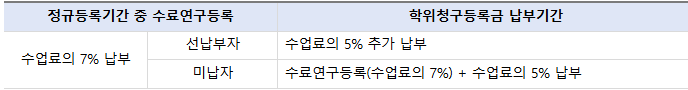 - 수료생: 학위청구논문심사 신청(서) 취소 및 반환 불가, 납부한 학위청구등록금(계열별 수업료의 5%) 및 수료연구등록금(계열별 수업료의 7%) 반환 불가