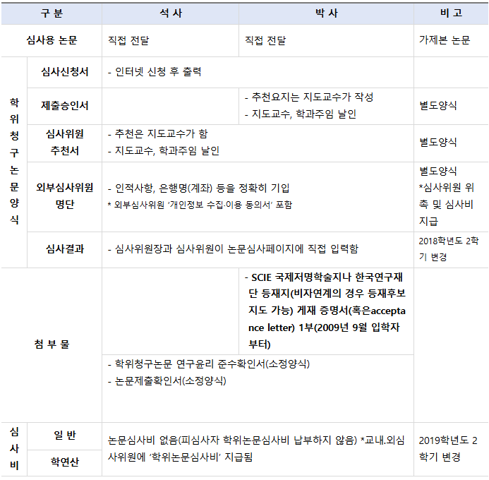 - 외부심사위원 있을 경우 추가 제출: 석사학위 청구논문 외부 심사위원 명단(T-3), 외부심사위원 동의서(T-4)